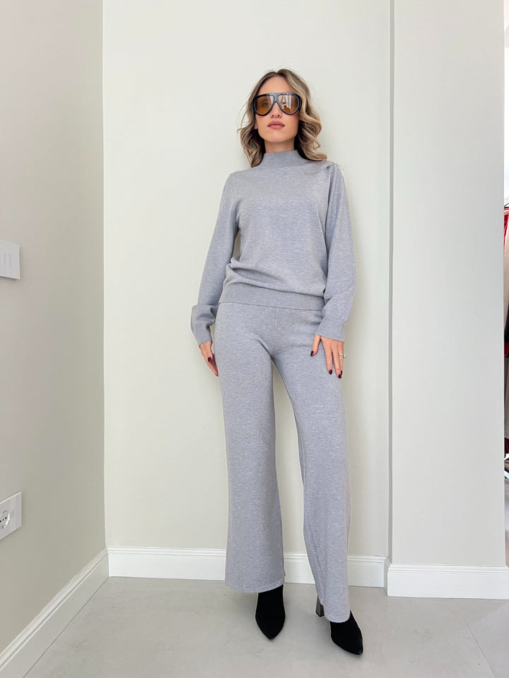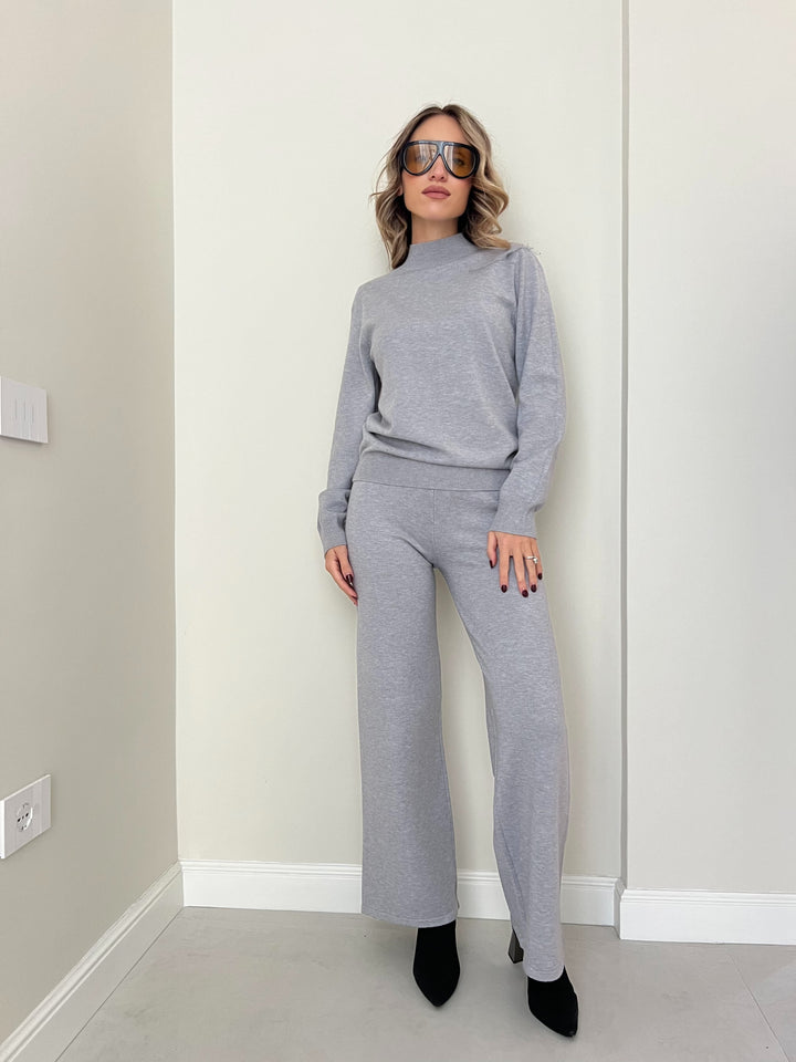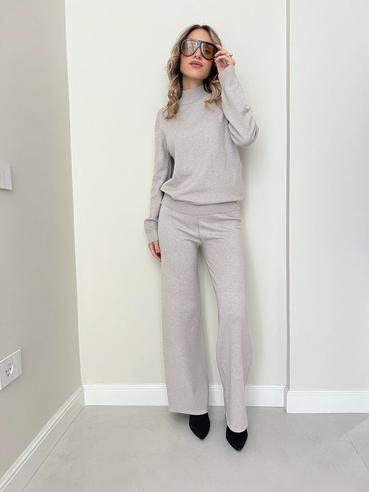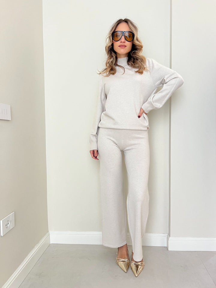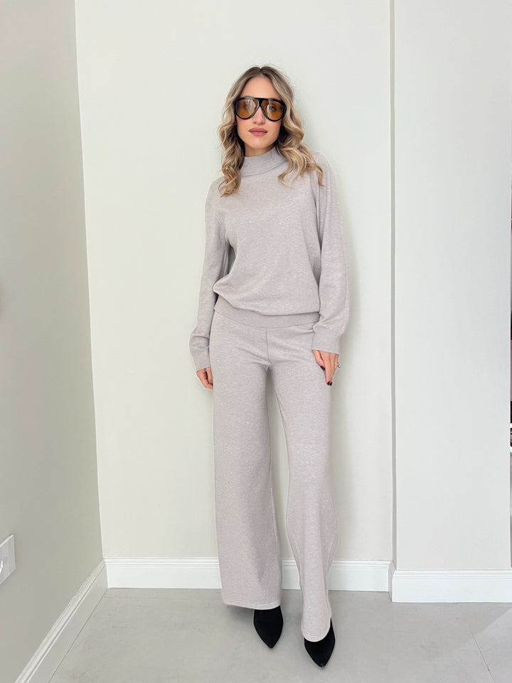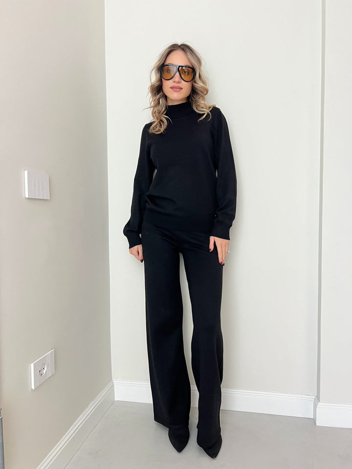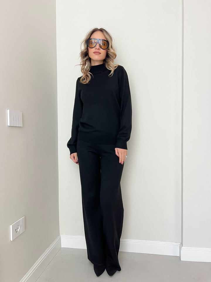 Maglia mezzo collo con trecce sul davanti e sulle maniche e pantalone ampio a gamba dritta per un look sofisticato ma rilassato.