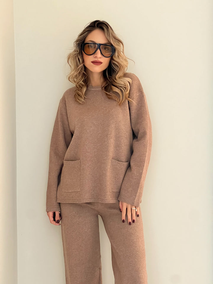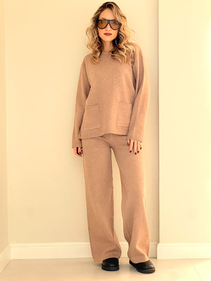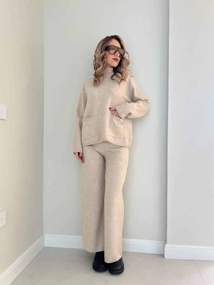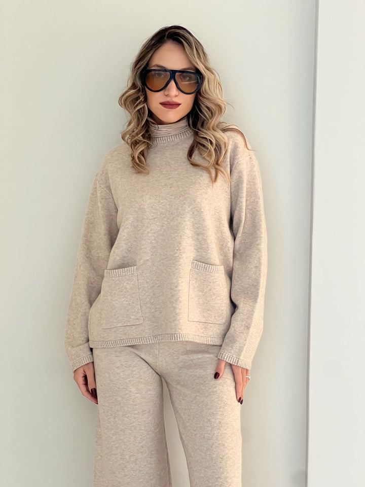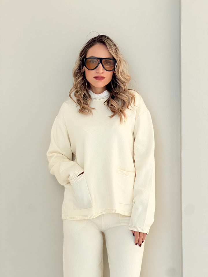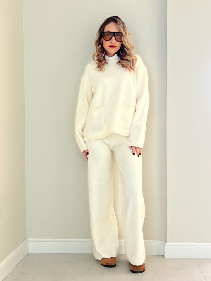 Maglione oversize e pantalone ampio a gamba dritta per un look sofisticato ma rilassato.