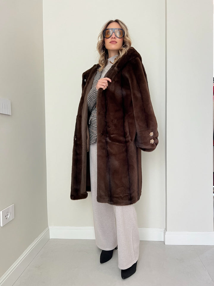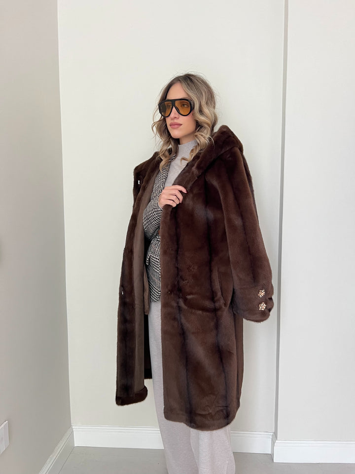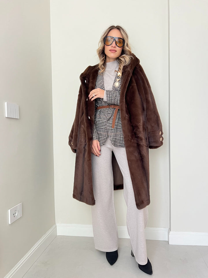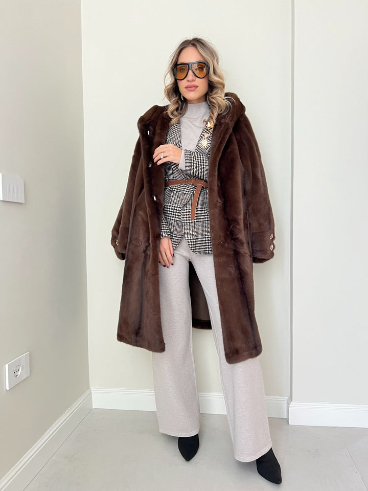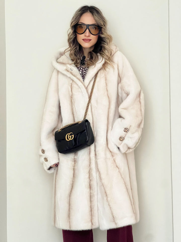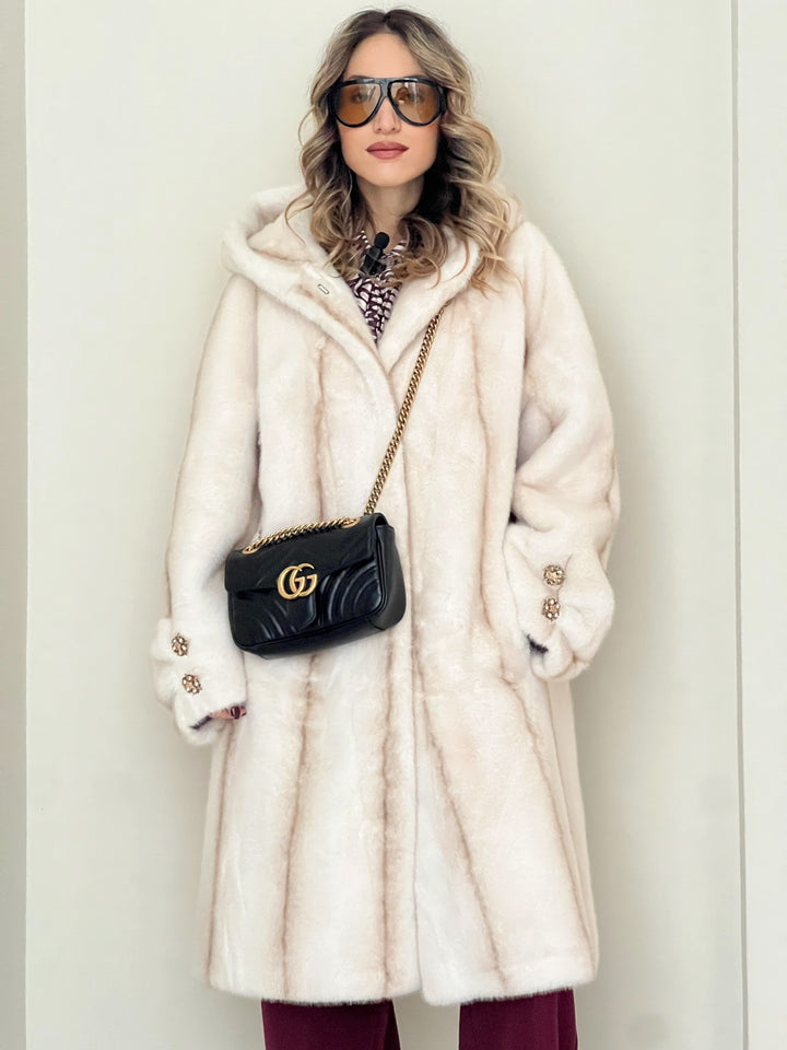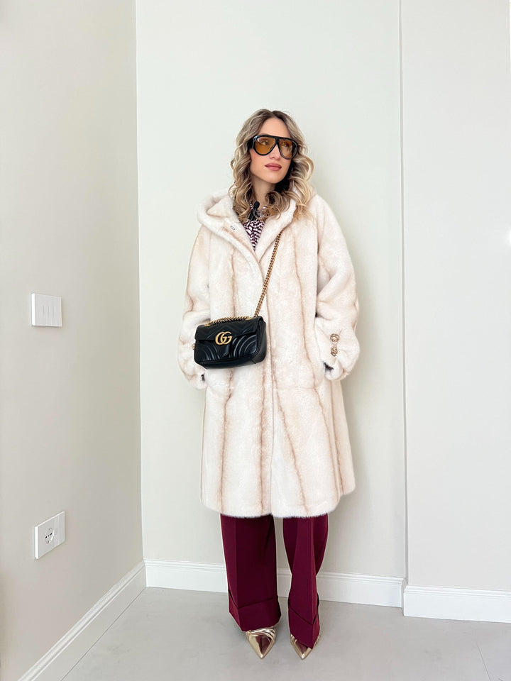 Pelliccia lunga effetto soft-touch in tonalità crema, caratterizzata da una texture soffice e avvolgente che dona immediatamente un look raffinato e luminoso. La linea dritta slancia la figura mentre il cappuccio aggiunge un tocco di modernità e comfort. Leggera ma caldissima, è il capospalla perfetto per completare outfit eleganti o dare un tocco luxury anche ai look più semplici. Un must-have per l’inverno, ideale per chi ama distinguersi con stile.