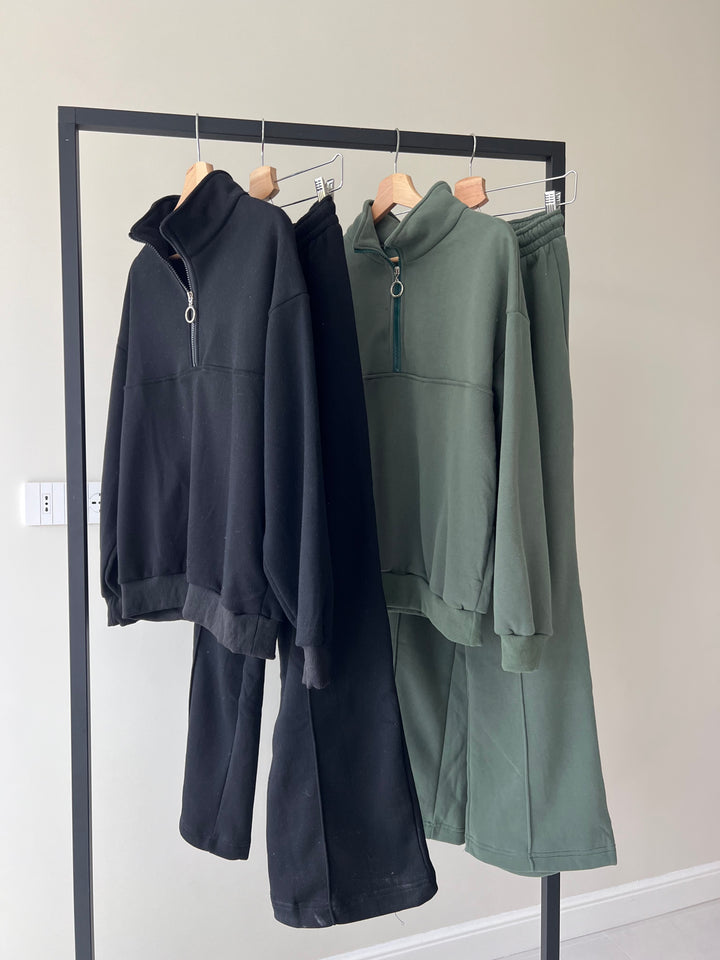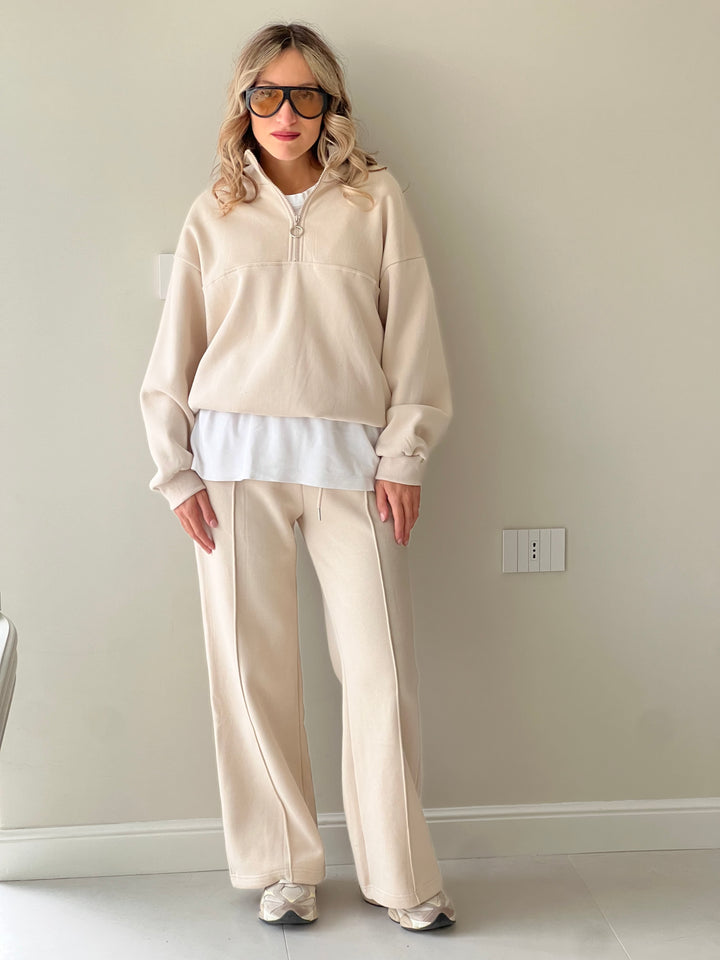 Il modello presenta una felpa con mezza zip dal taglio leggermente over e una vestibilità morbida e contemporanea.