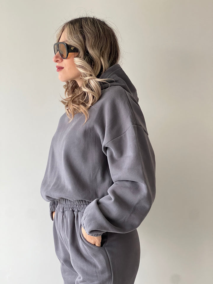 Il modello presenta una felpa crop con cappuccio dal taglio leggermente over e una vestibilità morbida e contemporanea.